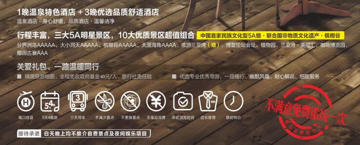 1、行程当中约定景点等其它项目(非赠送、升级类),如遇不可抗力因素造成无法履行,仅按游客意愿替换或按团队采购成本价格退费;行 程当中关于赠送、免费升级等项目,如遇不可抗力因素或因游客自身原因无法实现及自愿放弃的,均不退费、不更换。 2、“白天晚上均不推荐自费景点及夜间娱乐项目承诺”不适用于:景区交通工具、海上自愿娱乐项目、特色海鲜餐饮(海鲜自助火锅238元/人、潜水480元/人起、景区交通15元/人起,实际价格请以运营商公布为准);本产品为保证其服务质量,游客如需选择“额外精彩夜间娱乐项目”,必须自愿书面签字,导游方可安排。温馨提示:为保证游客体验,建议游客如需选择“额外精彩夜间娱乐项目”至多选择不超过2项。 3、折扣机票,不可退票、改签,请成人带好有效证件,儿童带好户口本;航班抵达前24小时以内取消合同的客人需收车位费200元/人。 4、旅游者如需新增购物或参加另行付费的旅游项目,需和地接社协商一致并在海南当地补签相关自愿合同或证明,敬请广大游客理性消费。 5、海南部分酒店标准相比内地偏低,如遇旺季酒店客房紧张或政府临时征用等特殊情况,我社有权调整为同等级标准酒店,全程不提供自然单间,单房差或加床费用须自理;酒店限AM12:00时退房,晚航班返程者,建议行李寄存酒店前台,自由活动或自费钟点房休息。 6、因报价已提供综合优惠,故持导游、军官、残疾、老人、教师、学生等优惠证件的客人均不再享受门票减免或其它优惠退费。 7、“不满意免费重玩一次”,不予折现,仅限本人使用,不适用于春节、十一等国家法定长假期间,“重玩一次”有效期,自行程结束后60天内有效,不包含往返机票等相关交通费用,“不满意评定标准”以地接社“游客满意度调查表”真实意见为判断依据。 8、蜈支洲岛景区因集中上岛游客较多,团队上岛可能会造成排队等候时间过长;分界洲岛、西岛、蜈支洲岛景区规定60岁以上及行动不便游客(包括孕妇)需填写景区的免责声明方可登船上岛;70周岁以上老年人出于安全考虑,景区不予接待(我社按团队采购成本价格予以退费)。 9、请如实填写当地《游客意见书》,游客的投诉诉求以在海南当地由游客自行填写的意见单为主要依据。不填或虚填,归来后的投诉将无法受理,如在行程进行中对旅行社的服务标准有异议,请在海南当地解决(24小时质检电话13303710757),如旅游期间在当地解决不了,应在当地备案。温馨提醒:旅游投诉时效为返回出发地起30天内有效。 |