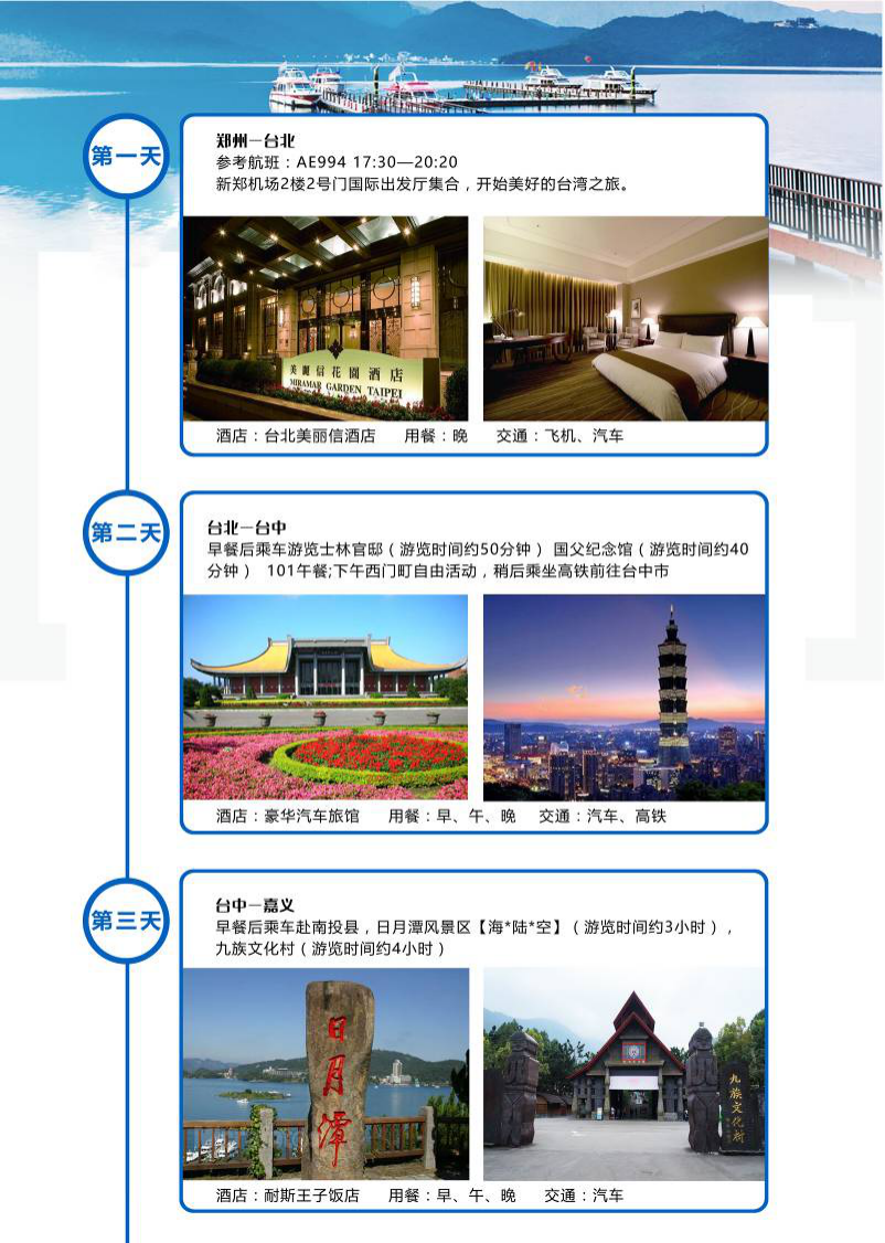 1. 郑州至台北往返飞机经济舱(含机场建设税,燃油附加费);